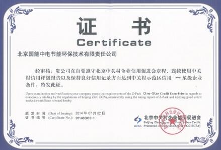 榮獲“中關(guān)村示范區(qū)信用一星級企業(yè)證書”